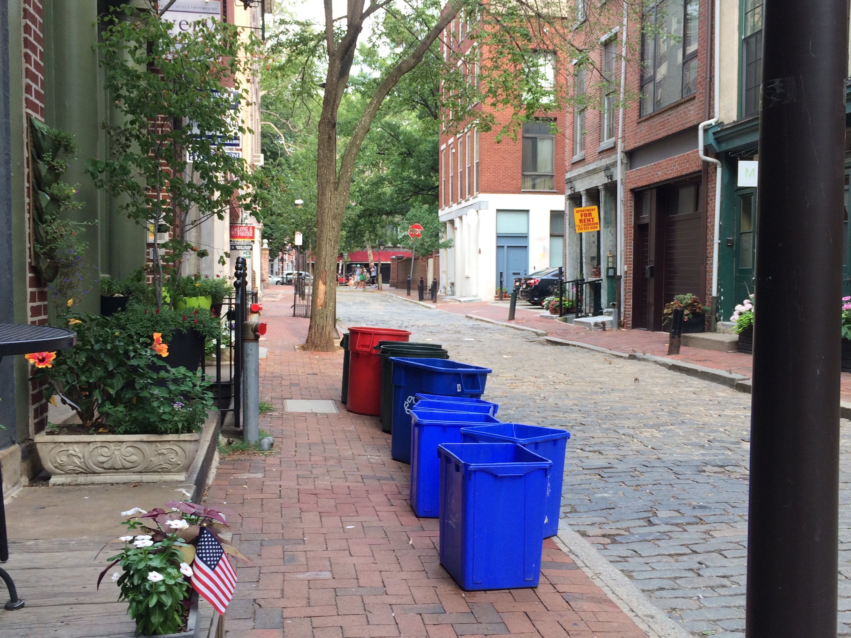 Old City’s Church Street is paved with grey bricks. They contrast nicely with plastic recycling bins.