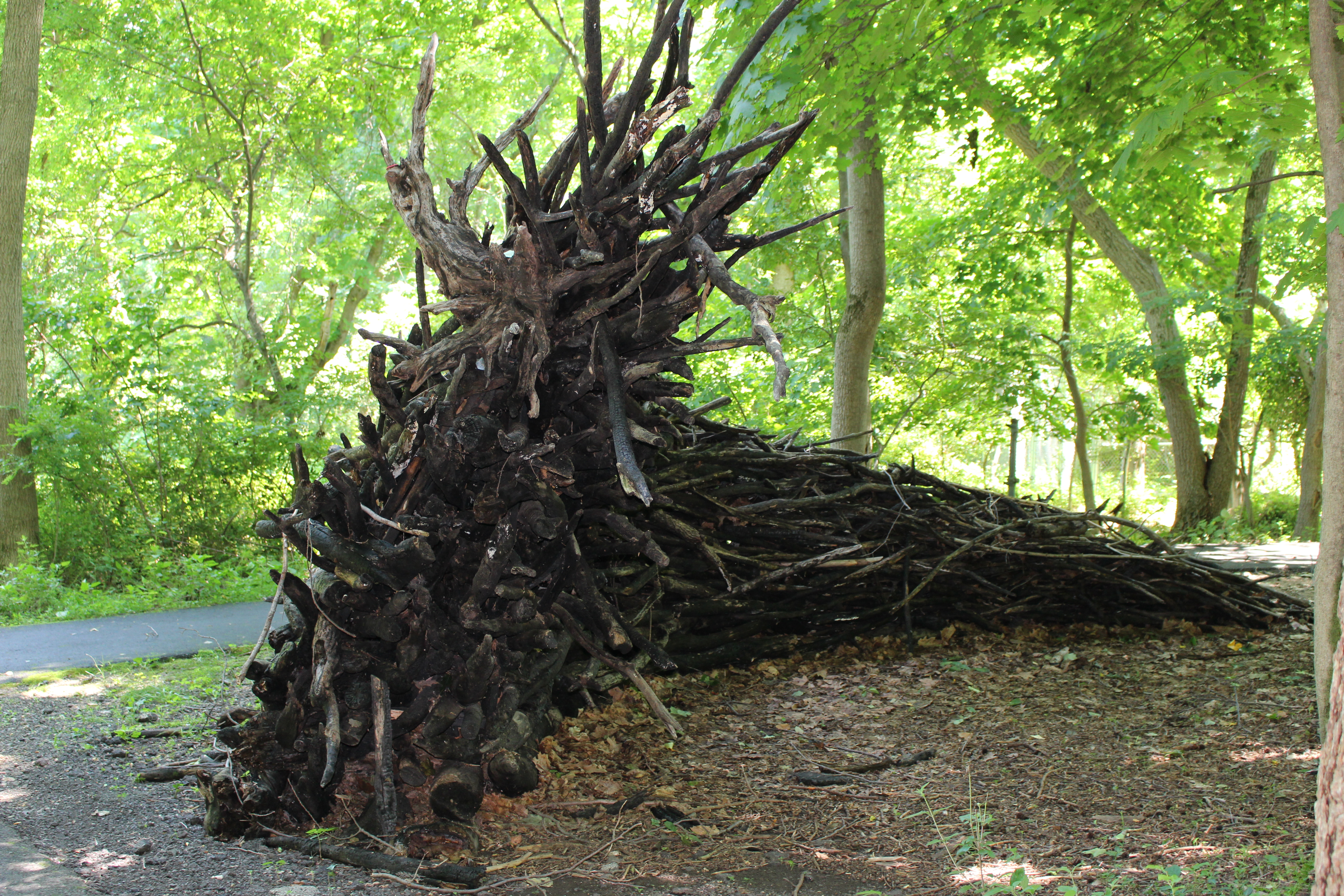 The sculpture I thought the most of in the woods was Alison Stigora’s Mazzaroth. It’s an assemblage of burnt tree branches fitted together tightly to portray . . . what? A serpent? The movement of time? As the years go on, Mazzaroth will crumble and become one with the forest floor, as will the trees surrounding it.