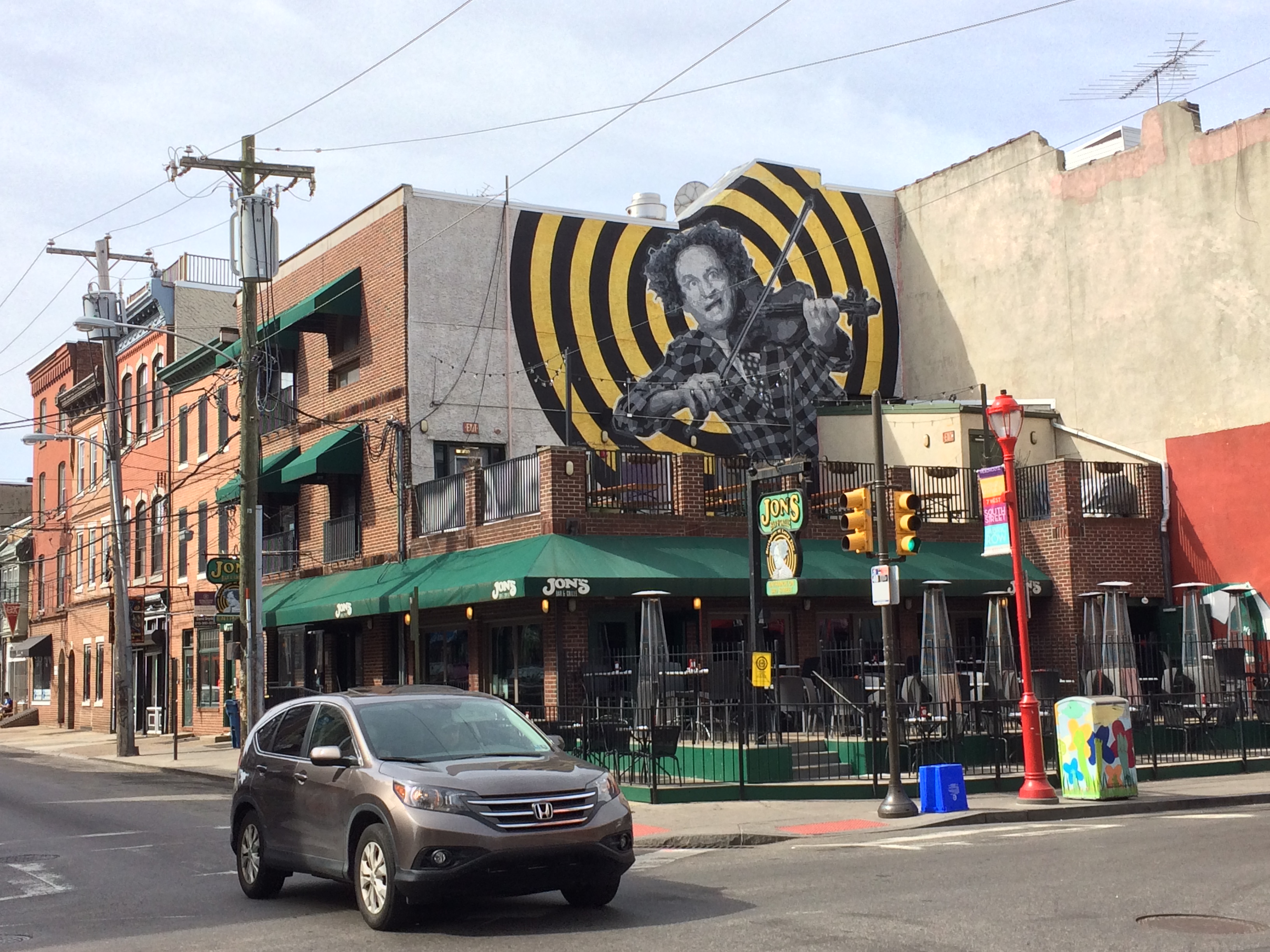 At 3rd and South I said to myself, “Wow, look at that mural.” It was painted on the side of the out-of-business and mourned Mako’s Retired Surfers Bar And Grill. A guy on a surfboard, a girl leaning against a fat-tire car, all done in sweet pastel hues. Lovely. And didst my eyes deceive me? Directly across the street from the former Mako’s was another mural, this one depicting the torso of a fiddle-playing, electric-haired madman inside yellow and black concentric rings. None other than Philadelphia native Larry Fine, one of The Three Stooges. Yeah, man, now we were getting somewhere.
