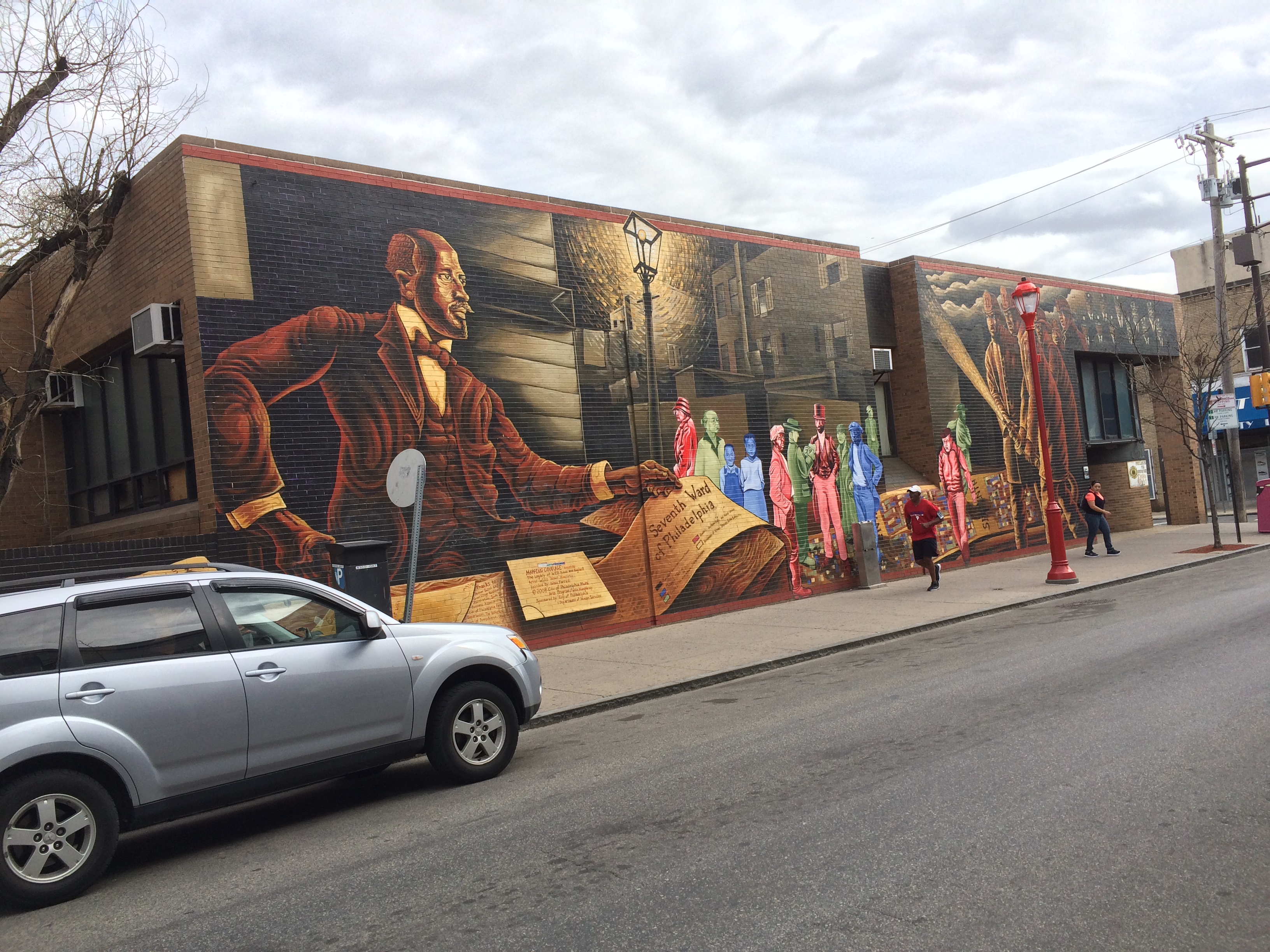 A little while ago I alluded to the fact that I’m no genius. Proof? I shouldn’t have been surprised to see the murals at 3rd and South, because I’d seen them before, though not in recent years. What’s more, I somehow also had forgotten that Philadelphia is the outdoor mural capitol of the world, thanks to Mural Arts Program, a public/private organization born in 1984. Incredibly, over 3,000 MAP- created works grace Philadelphia. No doubt, Mural Arts Program is one of the good guys. It aims to beautify all neighborhoods (from dilapidated to swank), to employ many folks in need of work and encouragement, and to inspire the general population. Big goals, all reached as far as I can tell.