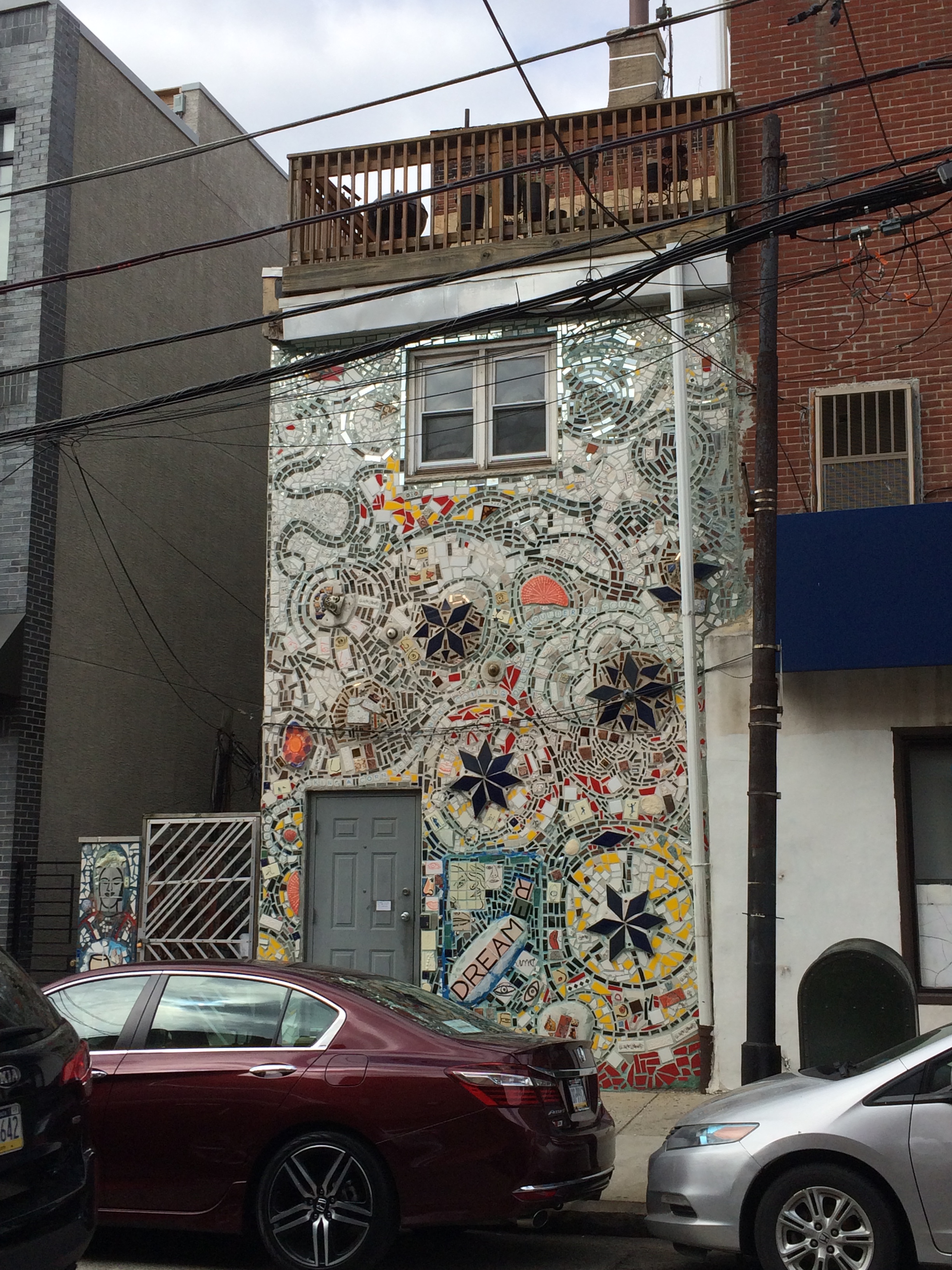 Soon after my walk began, a few minutes after I metaphorically tipped my hat to the Mako’s and Larry Fine murals, I started to come upon some unusually decorated homes, first on Leithgow Street, just off of South. And then on many other blocks near or on South. I had never seen these exterior wall decorations before, hadn’t known about them. They were something else, kaleidoscopic, multi-colored mosaics made from pieces of tile and glass. The design similarities got me wondering if one person had done all the work. I had a vague knowledge of mosaic artist Isaiah Zagar. I knew that he lived in the area and that he had established something called Philadelphia’s Magic Gardens. Were these freewheeling creations his? A bit later I learned that the answer was yes, and that he had begun adorning buildings quite a few years ago.
