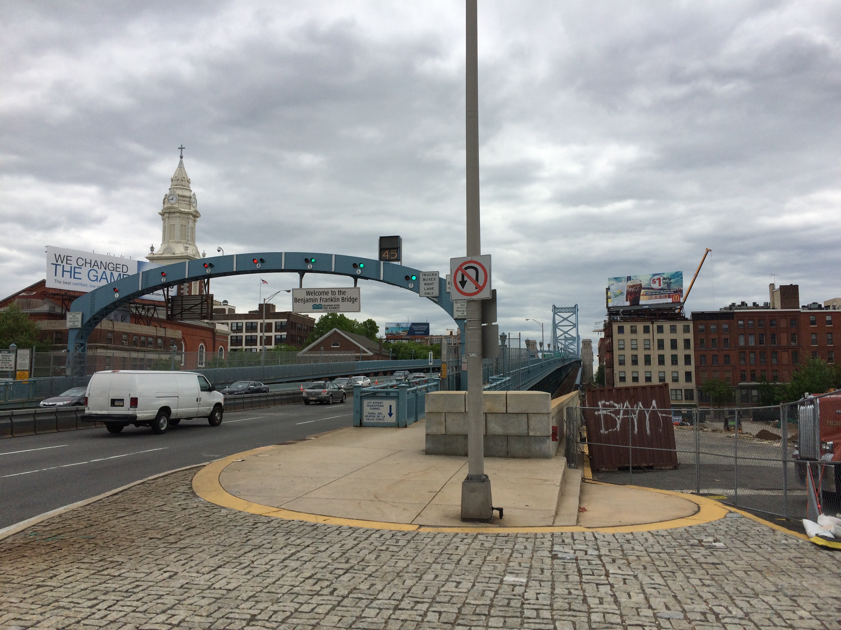 Half a block north of the mint I began my bridge adventure, for it is there that elevated lanes, for humans with motorized vehicles and for those without, start their ascent. Those lanes are segregated, though the walk sure would be highly intriguing, not to mention truly challenging, if they weren’t. I might run that notion past Philadelphia’s and Camden’s mayors. I’d never noticed the walkway before, despite having been in its vicinity half a million times over the years. It is there plain as day.