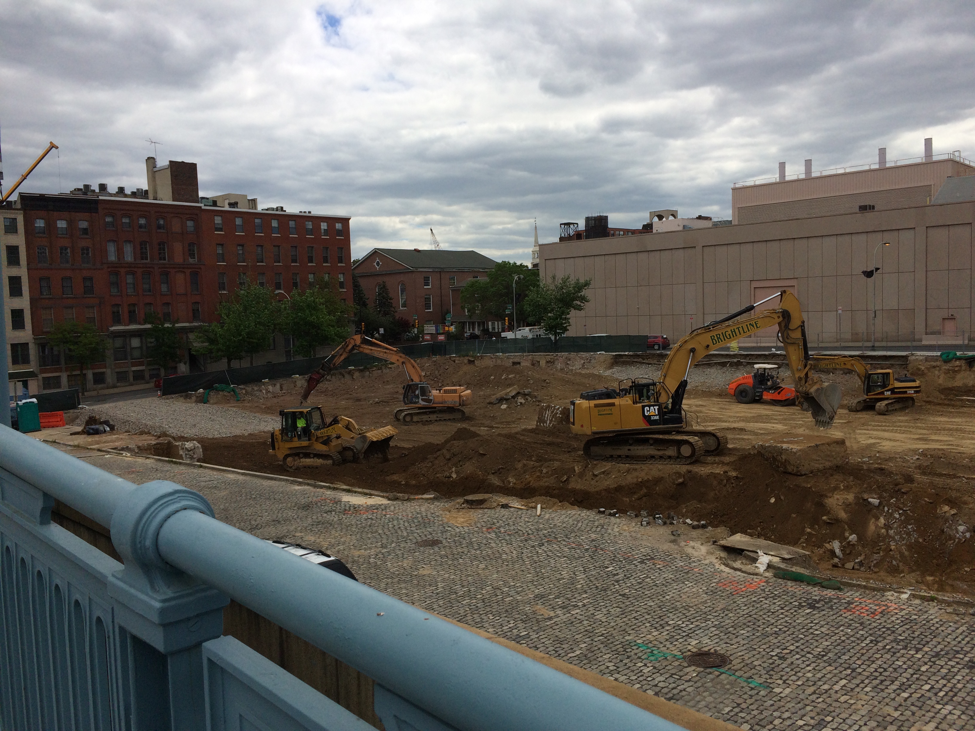 First thing I realized was that I should have worn more than a light shirt beneath my light jacket, because the winds were blowing pretty damn good, chilling my semi-ancient bones to a degree I wasn’t thrilled with. The second thing I realized was that within a matter of seconds I was 15 or more feet above ground. I looked to my right and watched a construction crew clearing the ground for what will eventually hold a fancy condo or rental complex. Who’d want to live beside a bridge’s entrance ramps is beyond me, but lots of things are beyond me.