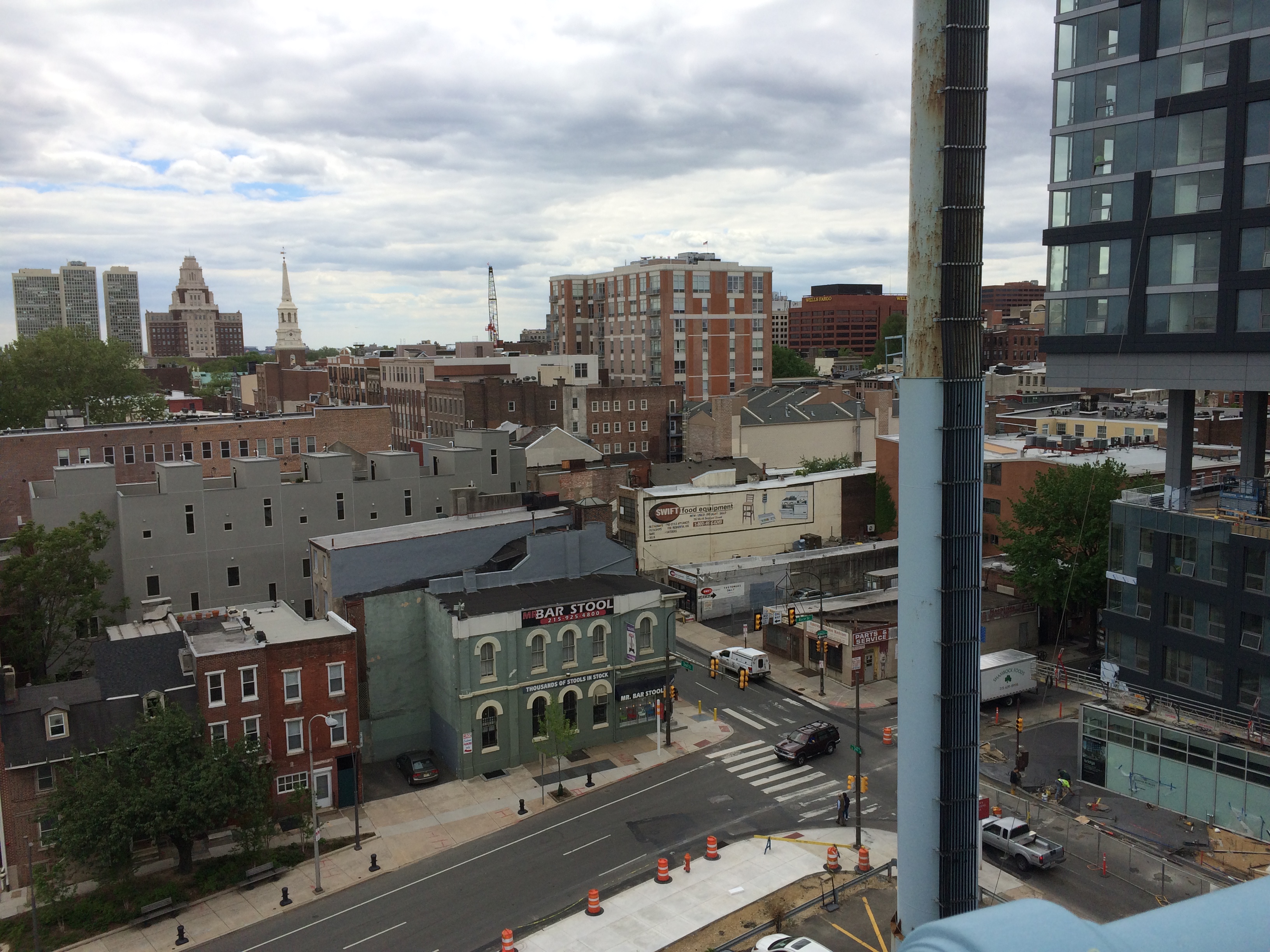 At this point I had the equivalent of eight or so blocks-worth of walkway to navigate before reaching the Delaware River’s western shoreline. The views were wonderful. I looked down upon 3rd Street, 2nd Street, Front Street and others, all of which I’m very familiar with and which were part of Philadelphia’s heart in its colonial days. Those are beautiful and quaint arteries, as many colonial era buildings remain there. But from high up I wasn’t paying attention to any specific structures. What grabbed me were the wild patterns, the crazy quilt formed by building sides and rooftops and signage in this non-high-rise section of the city.