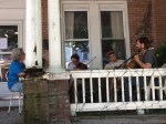 Between 4:00 and 6:00 PM, Sandy and I wandered around, program schedules in our hands. We checked out eight or so acts. The quality of the music was hit or miss. What we ended up liking the best was a mountain music jam session taking place on a quiet, leafy block of Walton Avenue. Fifty or so folks were soaking in the sweet sounds on the sidewalks and in the street. Most musicians at Porchfest, which presents many genres of music, amplified their instruments. But the mountain music jammers didn’t. No matter at all. I crept nice and close to the porch and got swept away by the sometimes gritty, sometimes aching and lonesome notes spilling from the musicians’ mouths and instruments. They were as casual and unassuming a group of performers as ever you’ll see, no different than the players strumming, picking and singing at their homes in mountain hollows in the southern states where this soulful, addictive music was born many years ago. I thought that Cameron DeWhitt killed on the banjo, that Jordan Rast fiddled like a demon, in a good sense, and that Peter Oswald set a firm footing with his cello work (Yep, a cello. It’s not the typical mountain music instrument, but at Porchfest it fit in just fine). Applause, applause.