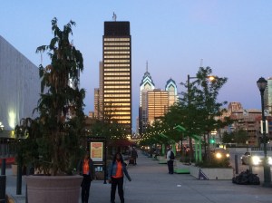 Come 6:00 PM, Sandy and I were getting hungry. Our dinner in a West Philadelphia hot spot (Dock Street Brewery) was good. But, as my mind is starting to wander and your eyes probably are getting tired from reading this story, I’ll skip the dinner write-up. I’d bid you all adieu right now had I not one more thing to add. Namely, at the train station in West Philadelphia where we boarded a choo-choo that took us back to the burbs, we were taken by a view of central Philadelphia, some of its tall towers beautifully aglow. The picture was too pretty a one not to snap. Snap it I did: