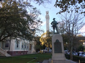 Fifty minutes into my exploratory venture, I caught a glimpse of that which the blogging gods suggested I focus on. Despite its being 252 feet from toe to head (it’s by far the tallest structure on vertically-challenged Cape Cod), and perched on a hill to boot, you can’t see the Monument from everywhere in town. Trees and buildings, though nowhere near as tall as the Monument, commonly obscure the view. But as I got closer to the old soul, I sought out perspectives that partly or fully brought it into my field of vision. I especially liked the way the Monument, three or four blocks away at that point, stretched its torso above a Gulf gas station’s sign on Bradford Street.