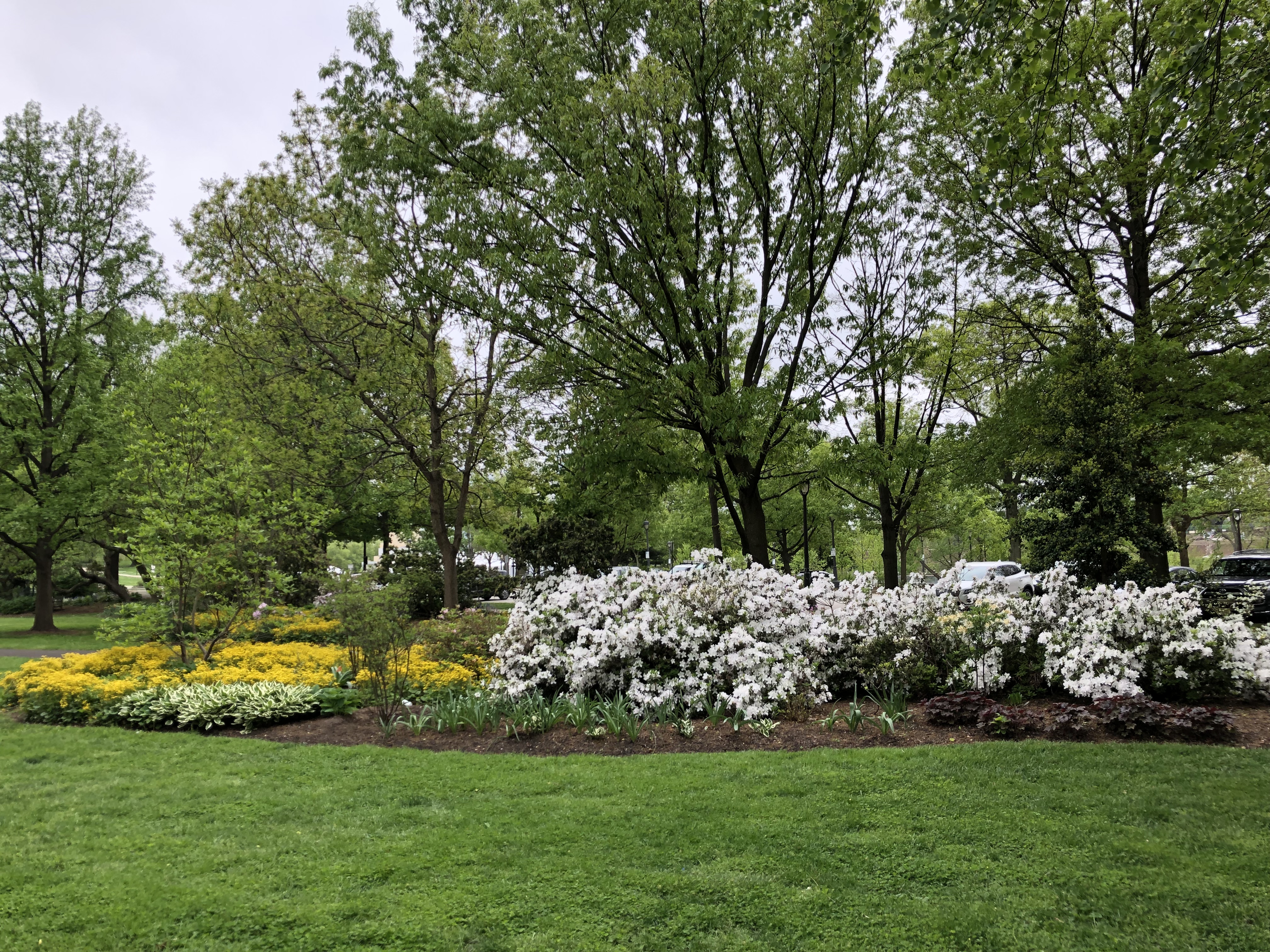 I hadn’t been to the Azalea Garden in 15 or 20 years. I had no idea what condition it would be in or how many azaleas it nowadays contains, but I guessed that all would be well. And it was. The AG is a sweet, four-acre park near the Philadelphia Museum Of Art, a few blocks outside the hustle and bustle of downtown Philly. Azaleas were plentiful and in bloom. White, pink, red, yellow and orange azalea blossoms looked smashing amidst the park’s greenery. Especially the white ones, of which there were thousands. I’m sure I’ve never seen so many white azalea petals in my life. They alone were worth the trip.