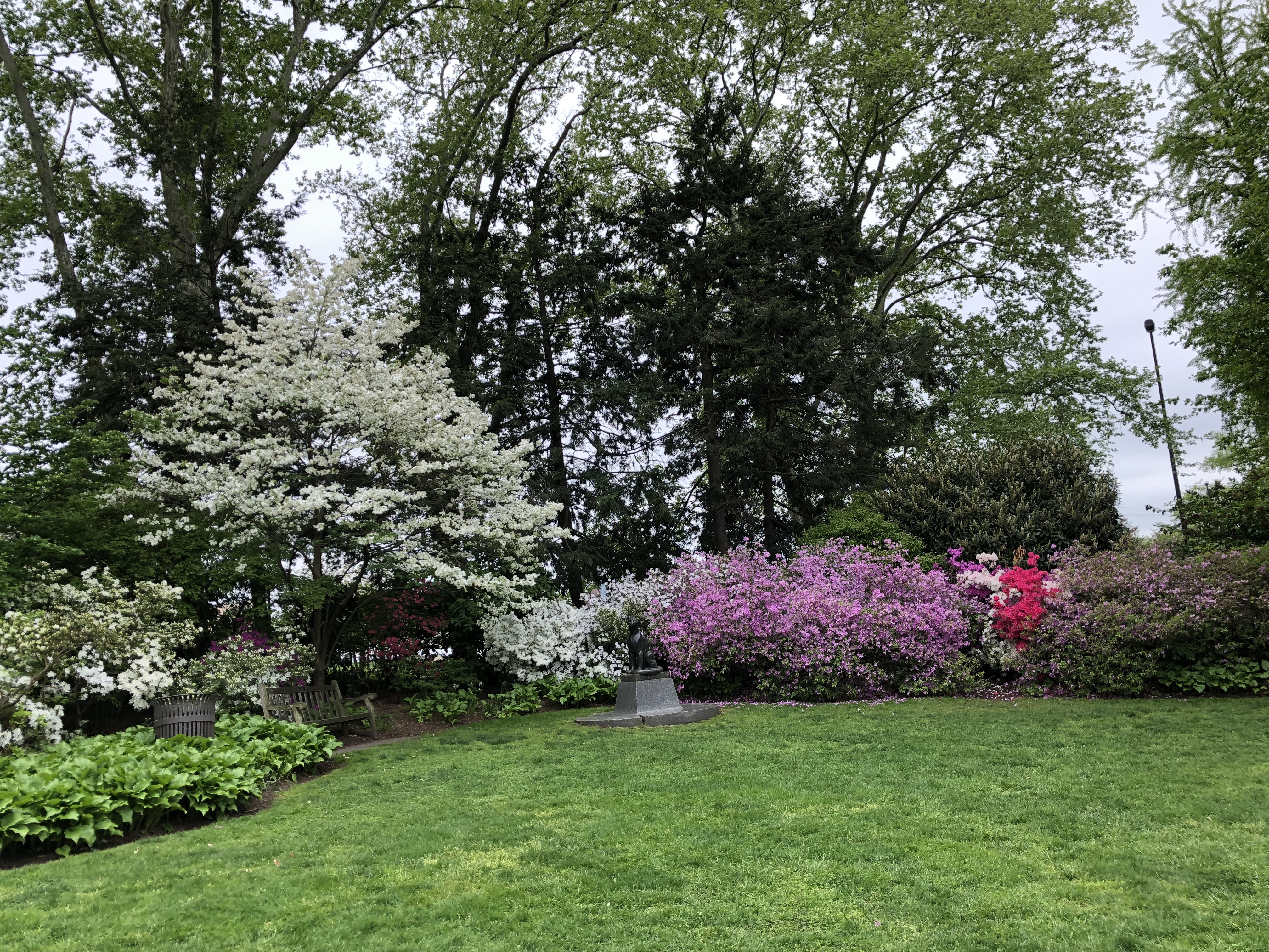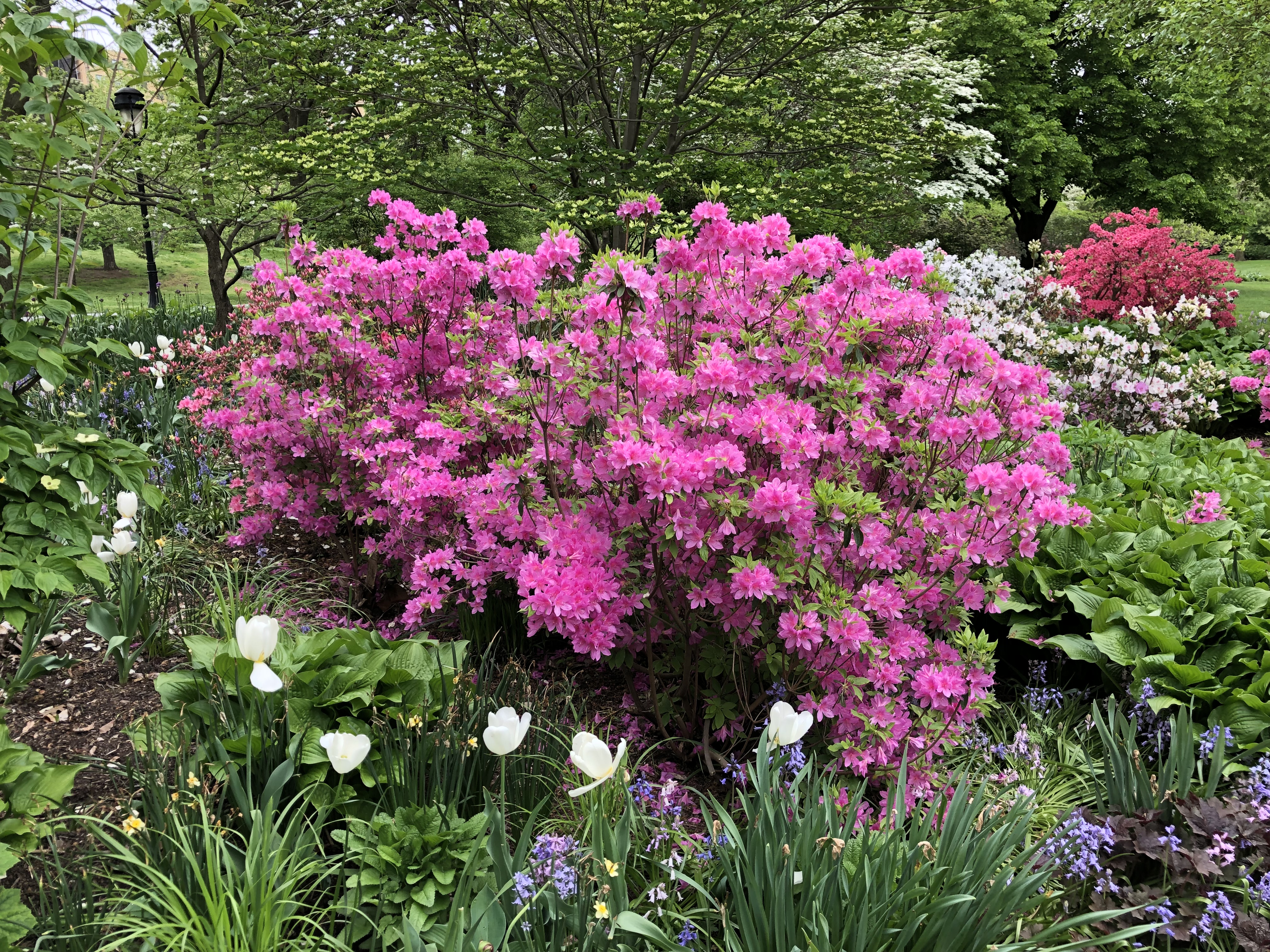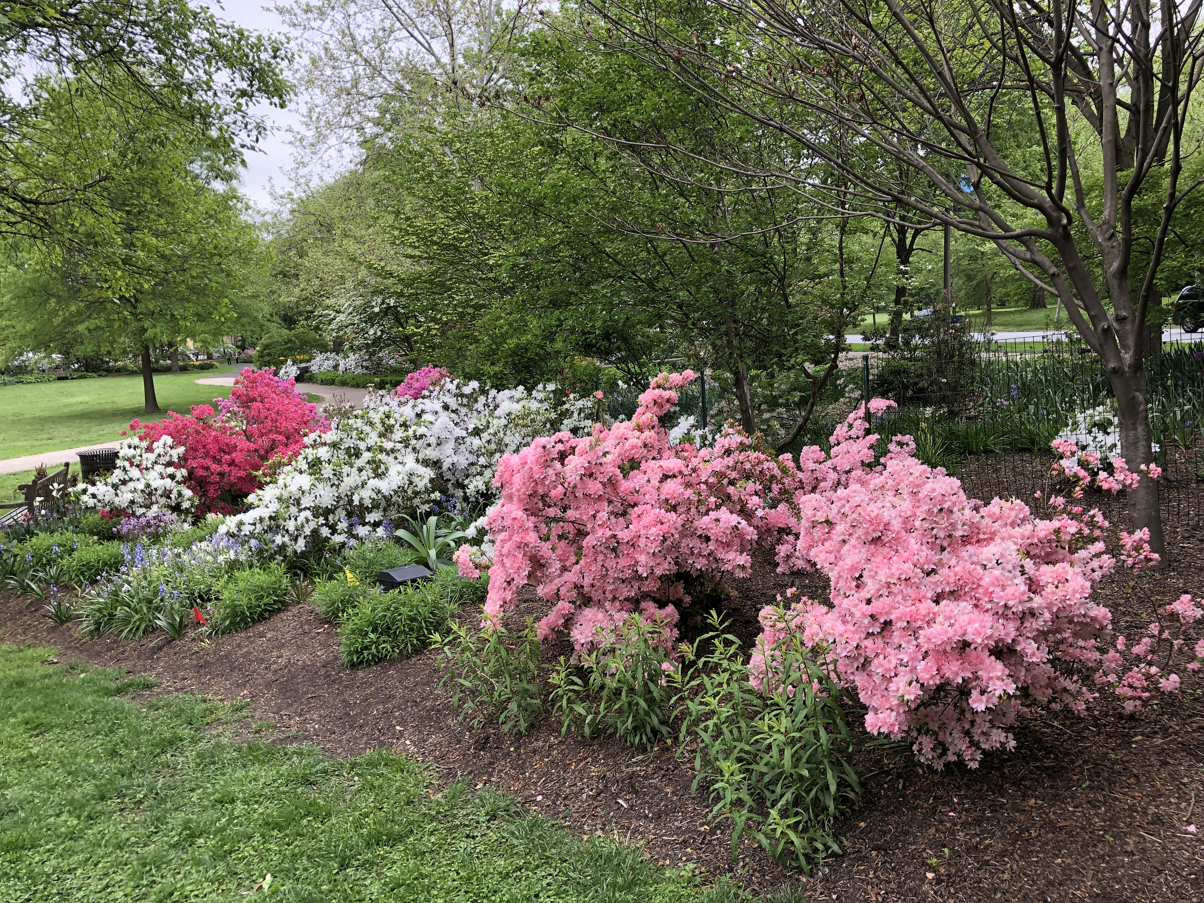 It was only a natural, therefore, that visiting Philadelphia’s Azalea Garden would strike me as the appropriate thing to do. I mean, come on, it’s called the Azalea Garden! And so, on the 1st of May, a cool and cloudy day, I boarded a train that transported me to the City Of Brotherly Love. But a few minutes before I climbed aboard, I snapped a photo in my neighborhood. The picture is of enormous and awe-inspiring azalea bushes that adorn the front lawn of my friend Joyce’s house. Regale your eyes: