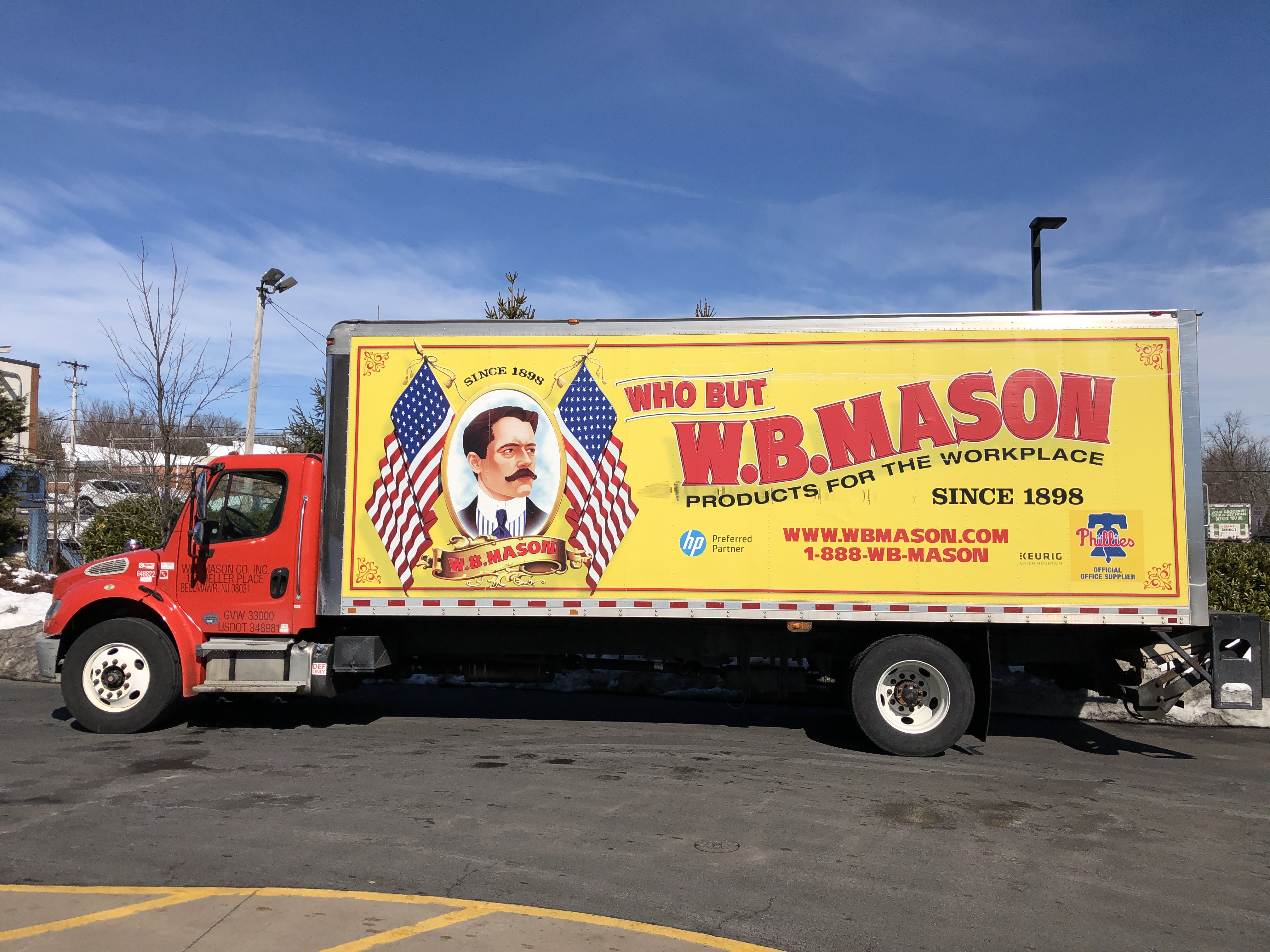 Still, as much as those two ring my chimes, neither is my favorite. I have to give the nod to the W.B. Mason vehicle. The Mason design is, to me, perfection. Bright, solid and beautifully balanced, it is impossible to ignore and easy to love. W. B. Mason, as is noted on the truck, was founded in 1898. Based in Brockton, Massachusetts for its entire life, the company distributes office and janitorial supplies, and numerous other products, throughout the USA. Whenever I see a Mason truck I find myself attracted to it like a magnet. But I normally spot them when they are in motion, not when I can have a good long look at them. February 24, 2021, then, was my lucky day, because on that date a W. B. Mason truck was sitting quietly in the parking lot that surrounds the Wawa food market in my suburban Philadelphia town.