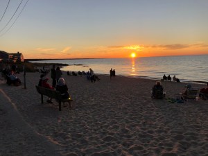 Our fondness for sunsets led us one evening this month to Skaket Beach, a smallish stretch of sand on Cape Cod Bay. Although it’s in Orleans, our home base, we hadn’t been to Skaket in years. Pulling into the parking lot, I couldn’t believe my eyes. There were a lot of cars there. Several dozen. And strung along the beach were 75, maybe 100 individuals, more by far than I’d ever seen gathered to witness a sunset. Most of the attendees were seated on the sands upon folding chairs that they’d brought with them. Folding-chairless, Sandy and I grabbed seats on a bench a few feet behind the beach and admired the lovely skies. It was almost 6 PM, and the Sun was only minutes away from saying bye bye.