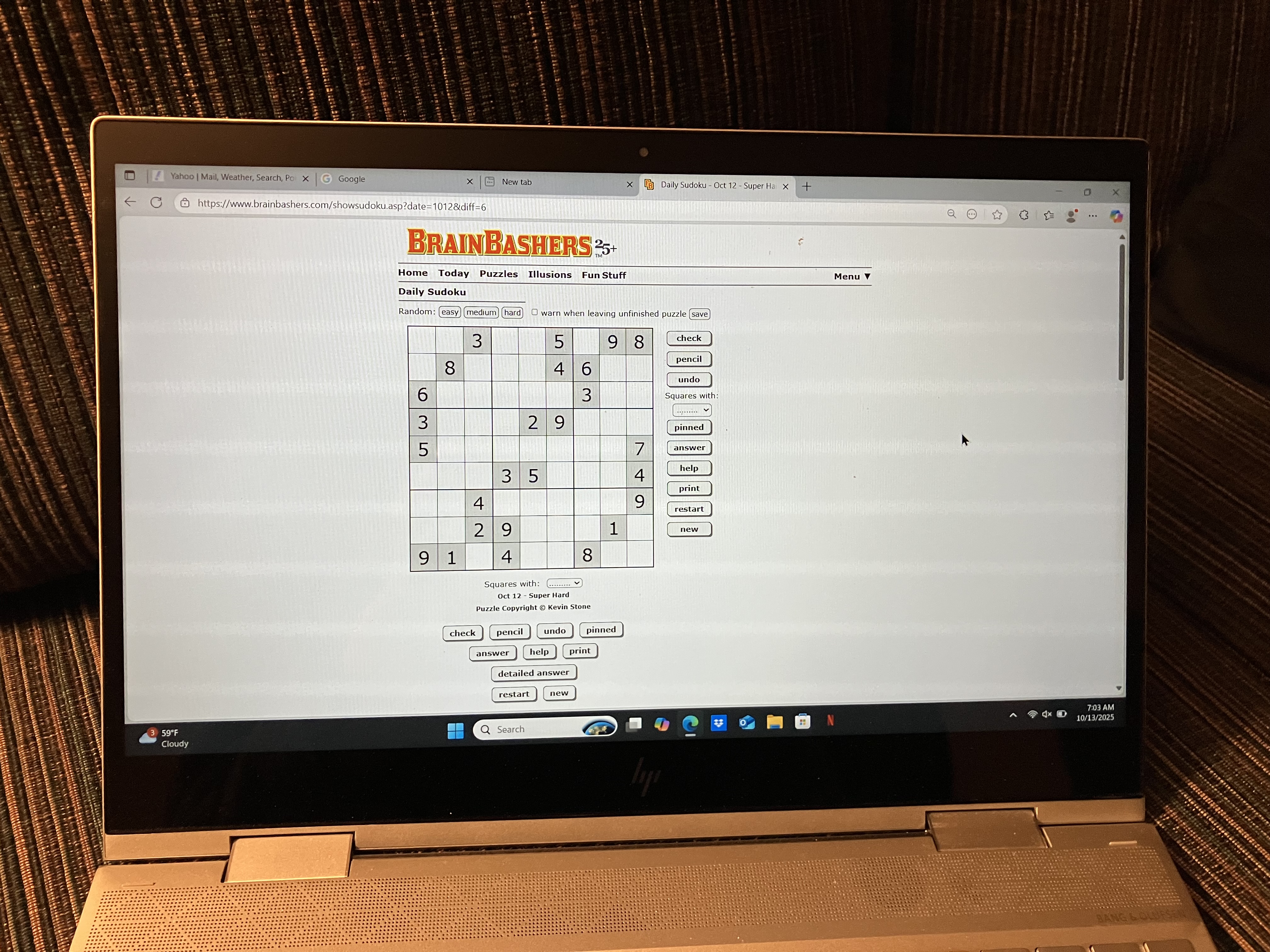 But wait, there’s more! After attending to personal hygiene matters and downing hot coffee, I kick off most every day by tackling one or two sudoku puzzles online, via the Brainbashers website. Man, I’m addicted to sudoku, a logic-based game involving the correct placement of numbers in a grid. I quickly became hooked when, in 2011, I researched and deciphered sudoku’s inner workings. I’ve interacted with thousands of sudoku puzzles since then.