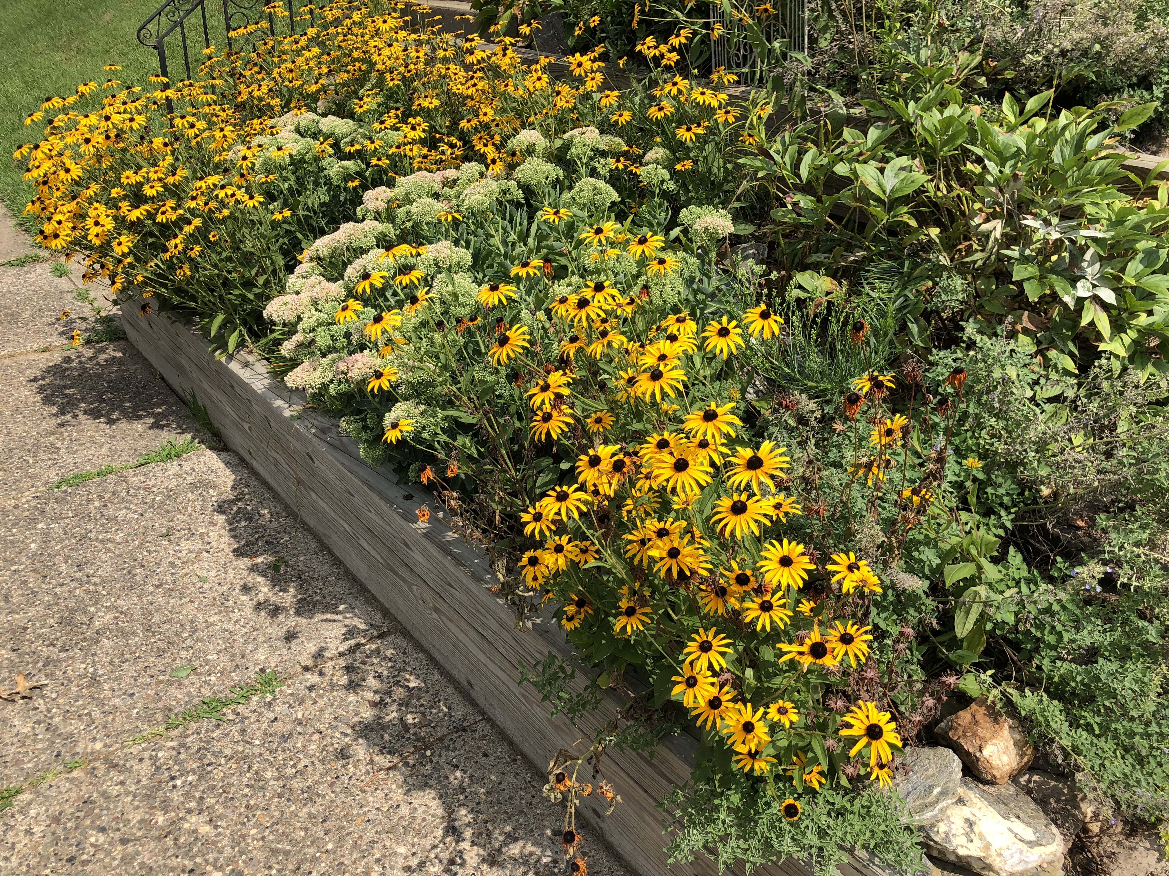 Okay, it’s time to mention the highlights of today’s trek. The first involves sunflowers. A year ago, on a neighborhood walk, I was delighted to find that a family two blocks away from my residence was a lover of sunflowers. They’d planted a load of the gangly, happy plants on a long narrow strip of their property. And a week or two ago I noticed that sunflowers were strutting their stuff anew there. Needless to say, I strode down that block this morning to snap the yellow beings’ portraits. Of the various yellow objects in my neighborhood, they are my favorites by far. Indeed, I am a total sucker for sunflowers, thanks to Vincent van Gogh, their greatest immortalizer.